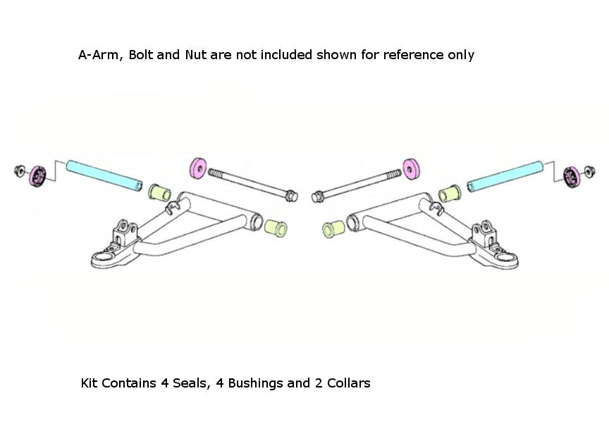 - Contains 4 Delrin bushings, 2 needle bearing shafts, 4 seals (enough for both sides)