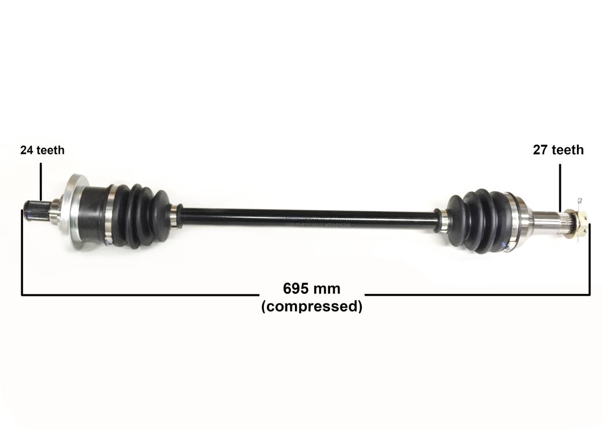 - Replaces OEM # 1502-940, 0502-733, 1502-347, 1502-803. Compressed length - 695 mm, Inboard spline count - 24, Outboard spline count - 27.