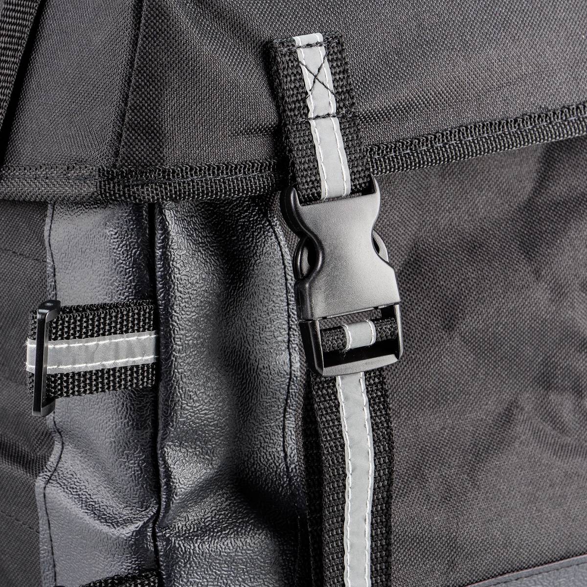 Features a rifle or fishing rod compartment with pull string to keep secure