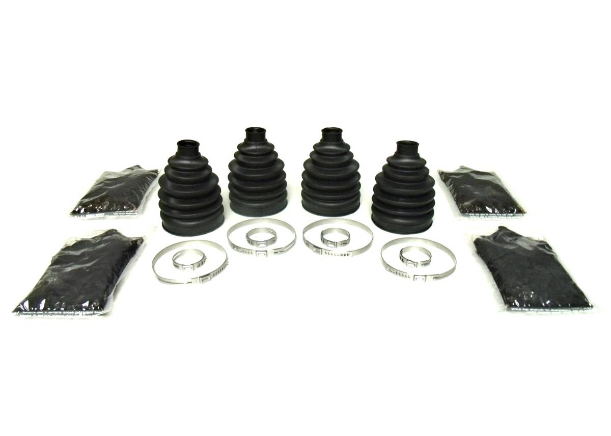 - Set includes 4 boots, 4 grease packs, 8 clamps