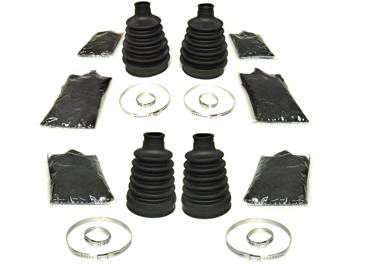 - Set includes 4 boots, 4 grease packs, 8 clamps
